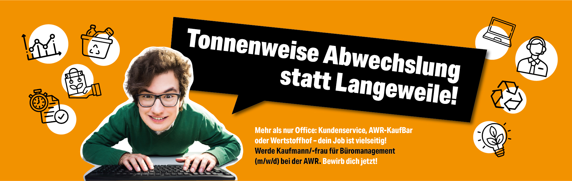 ➜ Du erhältst einen Einblick in viele unterschiedliche Bereiche und Aufgaben der AWR (z.B. Kaufmännische Abteilung, Service Team, Wertstoffhöfe, AWR-KaufBar, Kundenservice, Öffentlichkeitsarbeit, Vertrieb etc.)